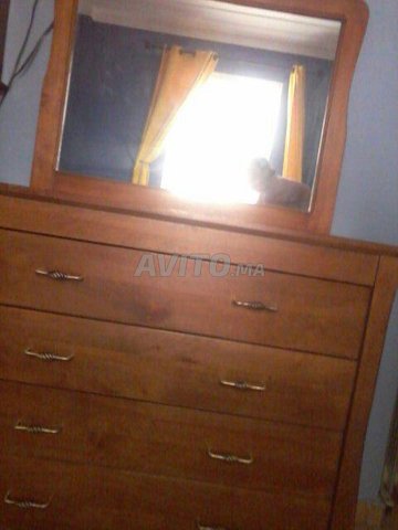 Lit en bois 160 cm/ 2m (sans matelas) plus commode 4 tiroirs avec miroir plus 2 table de chevets 2 tiroirs plus armoire 2 portes coulissantes,