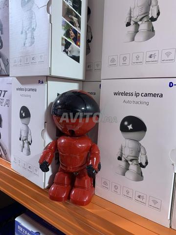 هادي صورة لروبوت صغير لونه أحمر مع خوذة سوداء، كيقف قدام علبات بيضاء مكتوب عليها wirelesip camera وAuto tracking العلبات مكتوب عليها رموز كتمثل مميزات الكاميرا بحال التخزين السحابي، عدسة HD، صوت ثنائي الاتجاه، كشف الحركة،والواي فاي. الروبوت شكله عصري وعندو تصميم جذاب للكاميرا الذكية. 🤖📸