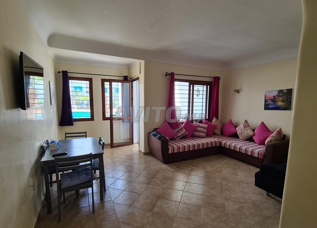 l'appartement est composé de salon avec chambre à coucher et 2ème petite chambre et cuisine équipée et balcon avec vue piscine et mer