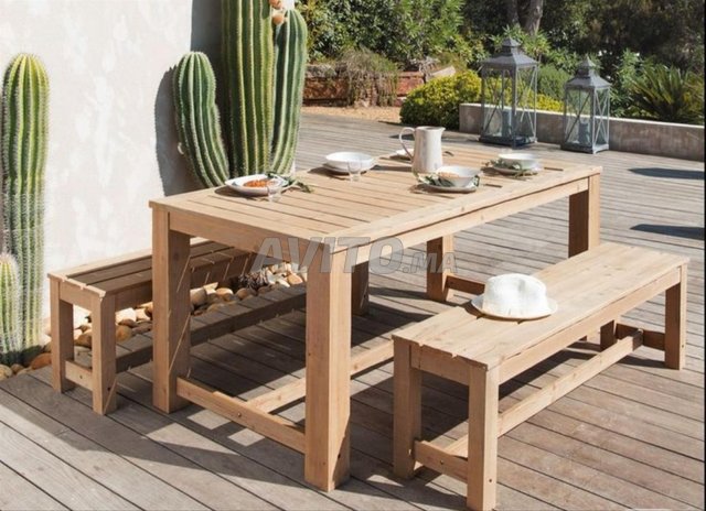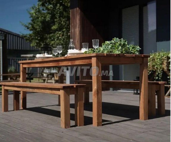 ENSEMBLE TABLE DE JARDIN ET DEUX BANCS EN BOIS BANKET 6 PERSONNES