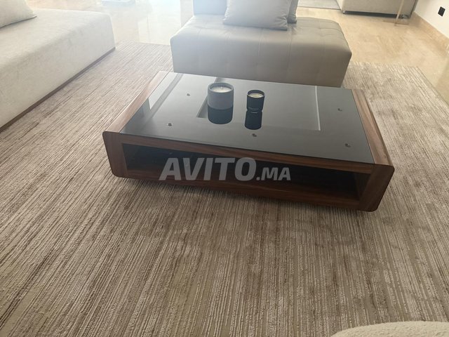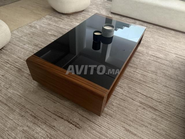 Je vends une superbe table basse de 140 cm en verre noir et bois, en excellent état.