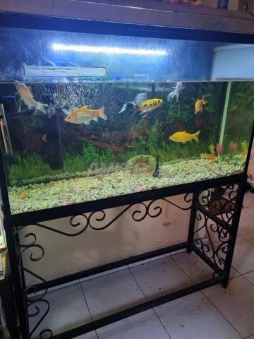 Grand aquarium avec six poissons et quatre escargots pommes. Avec pompe à eau, filtre et accessoires. Dimensions : 110 × 60 × 35 cm. حوض أسماك كبير مع ستة أسماك وأربع حلزونات تفاح. مع مضخة ماء وفلتر وجميع الملحقات. الأبعاد: 110 × 60 × 35 سم.