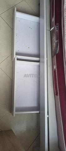 Je mets en vente une chambre d'enfants contenant un lit sans matelas avec deux tiroirs de rangement, plus une table de chevet de deux tiroirs et une armoire à trois portes en bon état. Merci.