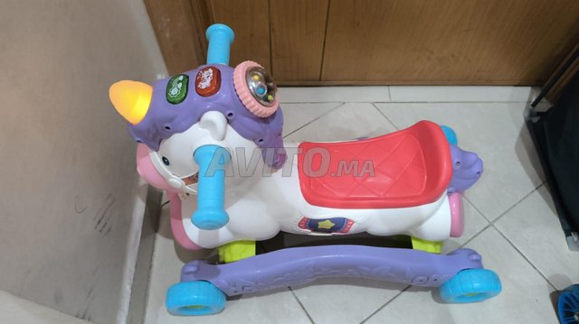 Un détecteur de mouvement déclenche des sons du poney ou des mélodies. Les boutons lumineux permettent de découvrir les couleurs, les animaux mais aussi de nouveaux lieux