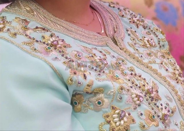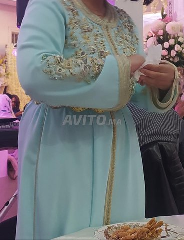 Bonjour, je mets en vente Un caftan en bleu Ciel deux pièces, entièrement fait à la main, travaillé façon terz et tenbat, presque neuf, avec mdemma, prix 3250 dh prix de vente 2000dh.