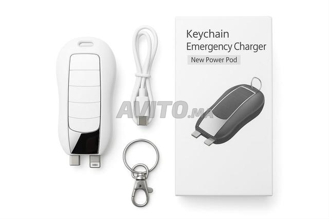 Chargeur d'urgence petit et moderne Power Pod qui peut être accroché aux clés. Il vous donne une charge instantanée pour le téléphone et est compatible avec Type-C et Lightning. Idéal pour les voyages, le bureau et les sorties.