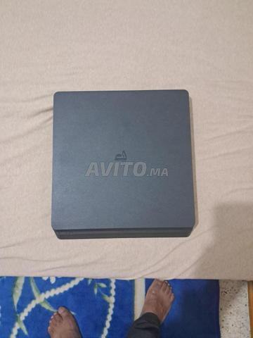 PlayStation 4 Slim كحلا، فيها 500GB، خدامة مزيان بزاف، معاها مانيت وحدة أصلية وحساب فيه لعبة FC 26. كلشي خدام بلا مشاكل،