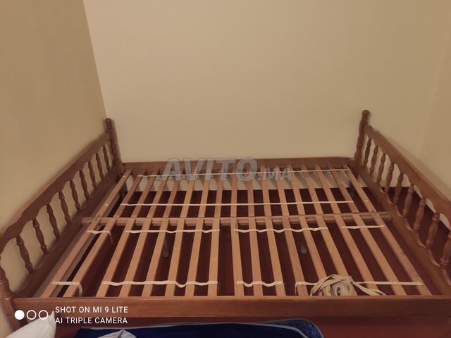 Le lit est en très bonne état et il est en bois.
