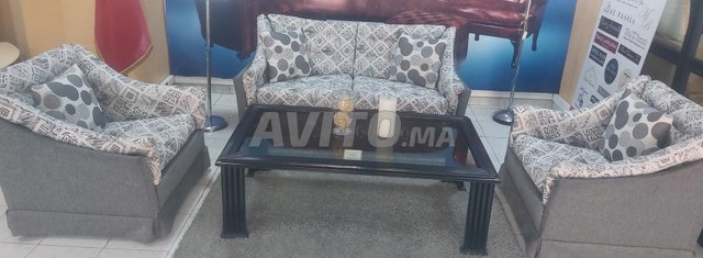 Ce coin salon présente un style contemporain mêlant confort et esthétique. Il est composé de trois pièces principales : deux fauteuils spacieux et un canapé deux places. L’ensemble est revêtu d’un tissu gris uni sur les côtés, avec des coussins et assises recouverts d’un tissu à motifs géométriques noirs et blancs, ajoutant une touche graphique et moderne.