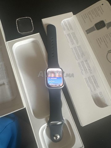 Je mets en vente Watch Series 9 GPS, Boitier en Aluminium Argent de 41 mm, Bracelet Sport Bleu Orage acheté à Apple en FRance avec facture état neuf avec la coque acheté à 449 euro