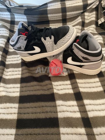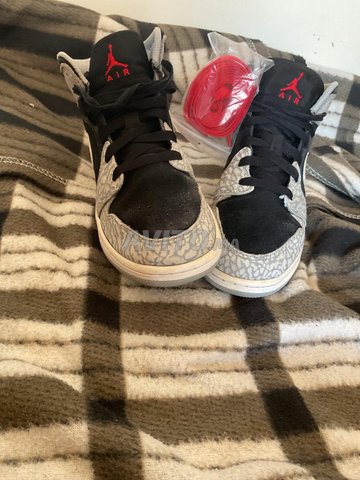 Jordan 1 Mid Elephant Print, taille 38, édition limitée importée UK. Rare, excellent état, couleurs noir/gris avec motif éléphant, Swoosh blanc. Lacets noirs et rouges inclus. Prix : 1500 MAD.