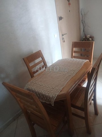 Table en bois avec 4 chaises en bon état. Convient pour la salle à manger ou la cuisine. Il n'y a pas de cassure ni de défaut évident, seulement une légère usure.