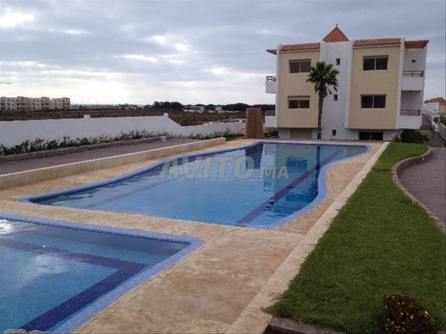Appartement meublé à Sidi Rahal Dreamland 2 dans résidence fermée sécurisée pour vacances d’une période de 5 jours minimum pour une famille de 5 personnes max. Salon Chambre à coucher.Cuisine donnant sur une cour .SdB . piscines pour adultes et enfants . Accès direct à la plage