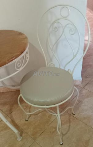 Vends table avec plateau en marbre et pieds en fer forgé blanc avec 4 chaises en fer forgé blanc en bon état général ,