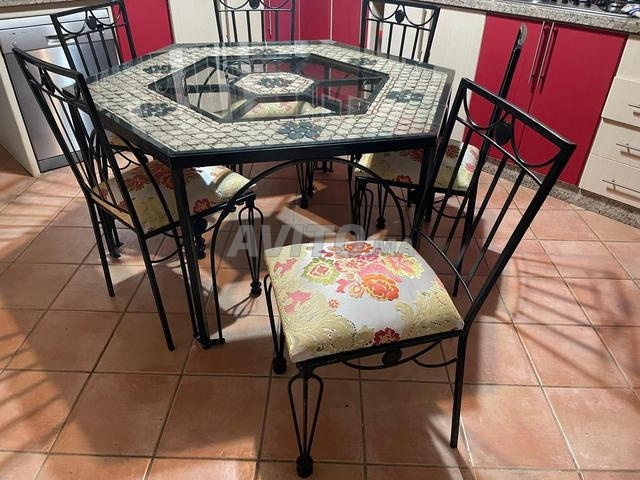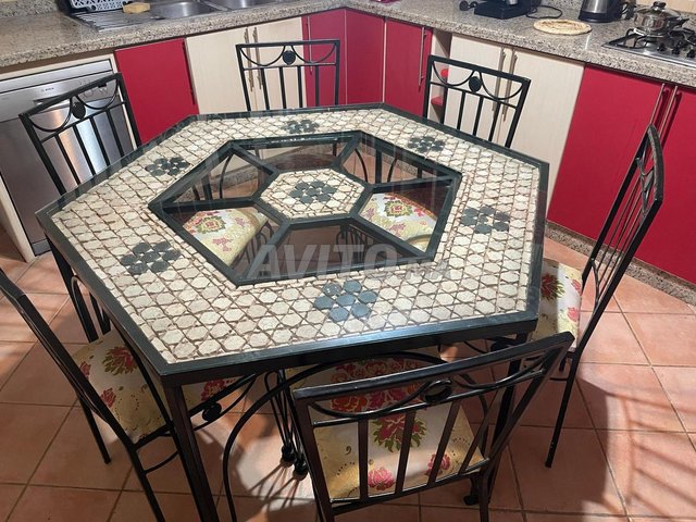 : bonjour, je vends une table et 6 chaises Artisanal fabriqué à Fès , la table fait 1,40 de Diamètre . Prix d’achat : 10 000 dirham, je les vends pour manque de place.