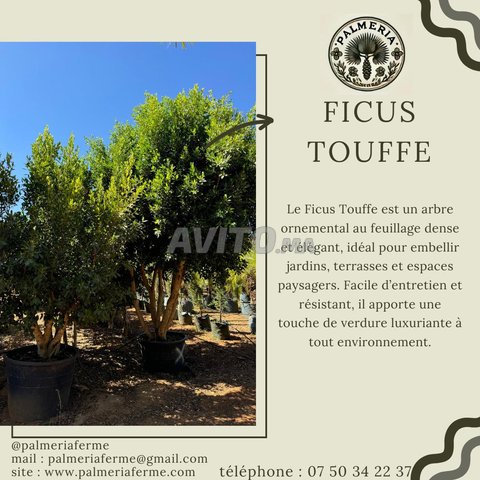 Le Ficus Nitida en touffe est un arbre ornemental très apprécié pour ses multiples troncs et son feuillage dense. Il est parfait pour créer des haies, donner de l’ombre et apporter une touche décorative élégante aux jardins et villas.