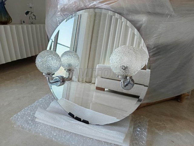À vendre un miroir de salle de bain rond (diamètre 60 cm) avec 2 lampes intégrées.