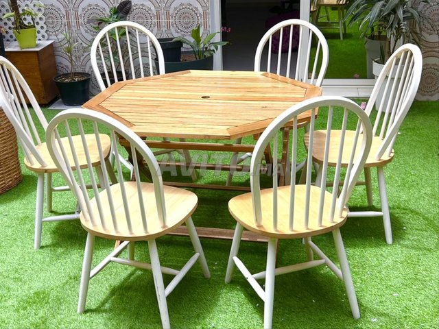 Table octogonale et pliable en bois de teck de très bonne qualité, avec 6 belles chaise design 'Boraam Windsor'. utiles en extérieur en terrasse ou jardin comme en intérieur.