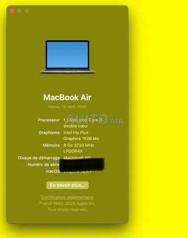 Macbook air de 2020 avec 256 Go.