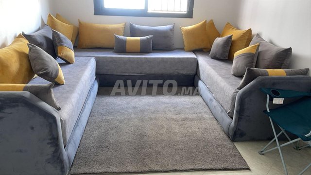 Salon d'occasion en très bon état [ 2m ] [ 2m ] [ 2.30 m ] 4 petits coussins, 4 moyens, 6 grands et 4 poufs. Avec une table en bois excellent et un tapis turc.