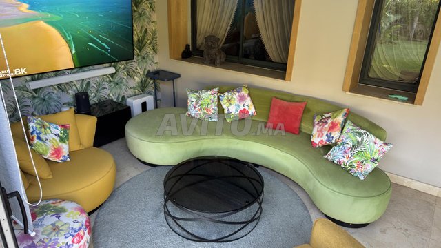 Je mets en vente un beau salon en très bon état avec des couleurs vives et très belles (canapé vert avec coussins, pouf imprimé, tapis, table, fauteuil moutard) au prix de 7000 dh.