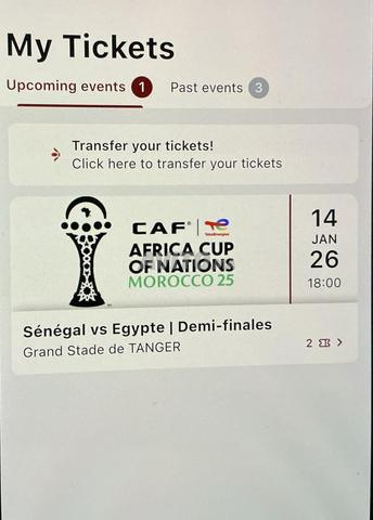 Vends 2 tickets catégorie 1 pour la demi finale Égypte / Sénégal au prix officiel de lancement de 800 dhs x 2