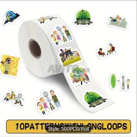 Rouleau de 500 autocollants contenant des stickers amusants de personnages d'anime Rick and Morty et utilisés à des fins multiples.