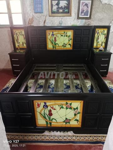 Grand lit fabriqué à la main de manière traditionnelle à partir de bois de cactus, également appelé bois de Ltr (2,44 m de large, 2 m de long et 1,44 m de large pour le lit) avec une paire de coiffeuses et des miroirs d'Espagne (les équipements sont en excellent état)
