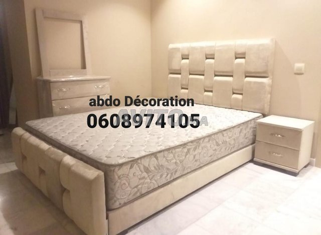 أثاث منزلي بالجملة والتقسيط في جميع الألوان. كادر توب موبر 140/190=1300 درهم. كادر جلد 140/190==1300 درهم. ماطلة ريشبوند طبي==1300 درهم. 2 طاولة ليلية ==500 درهم. كومود كبير 4 أدراج وكادر مرآة 650 دره...