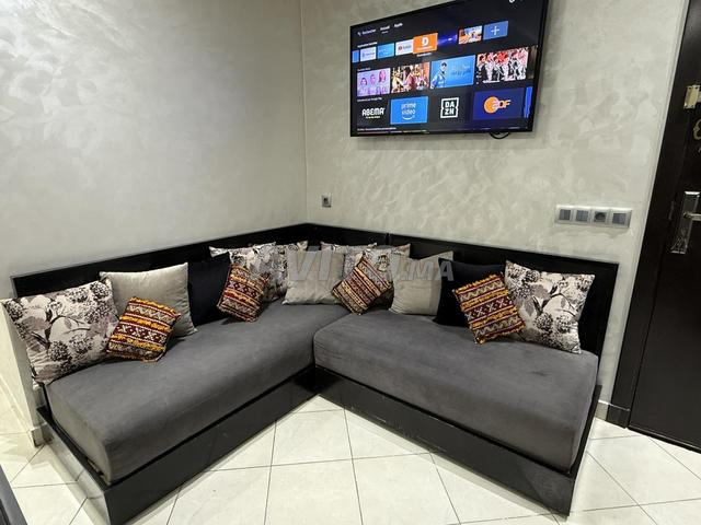 salon style roche bobois Gris coussins bleu vient d'être refait (acheté initialement chez CASA MUNDI à 40000DHS) Grande banquette 3m petite banquette 2,55m profondeur 90CM Avec petit meuble d'appoint ...