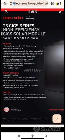 Vends 40 panneaux photovoltaïques TSMC 140W (6kW) de 2014 en parfait état. Prix 970dh l'unité ou 32000le lot. Design élégant avec dos miroir noir, idéal aussi pour réaliser une clôture moderne et esth...
