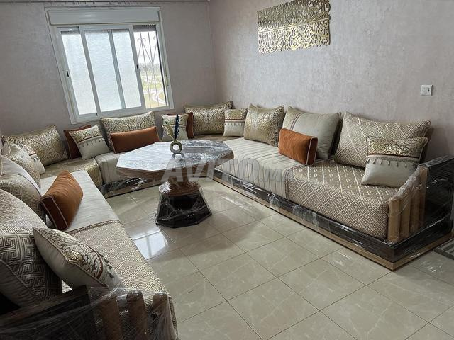 Bonjour, je mets en vente un salon marocain complet : bois (sdader dial l3oude) matelas (lemdarbate) richbonde une grande Table en bois deux petite table en bois les couvres matelas complet avec le...