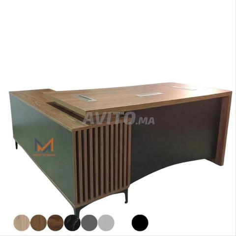 Bureau de direction d'importation avec retour en bois MDF 1 plan principal constitué d’un plateau et deux pieds d’épaisseur 38 mm. Profondeur 800 mm hauteur 740 mm 1 voile d’épaisseur 19 mm Les pièt...